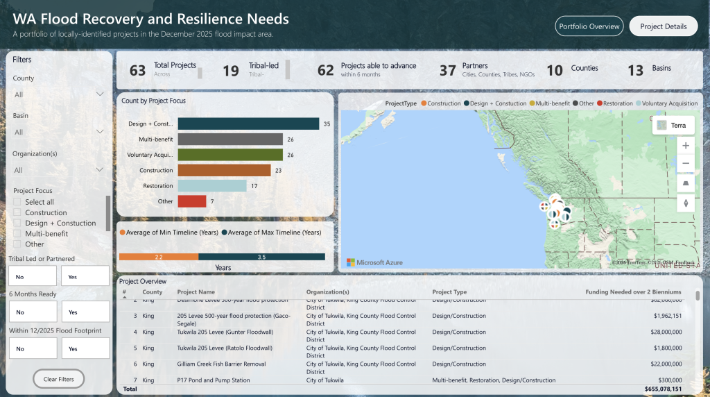 The integrated floodplain management network is ready to mitigate impacts of floods on lives, food systems, communities, and infrastructure. As the state looks to reduce risk in ways that prevent future harm, this tool provides a list of actionable investments for tribes and communities across Washington State to advance this goal and during hazardous floods, reduce impacts by: